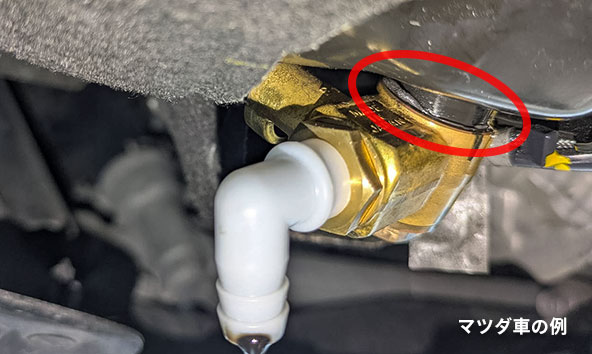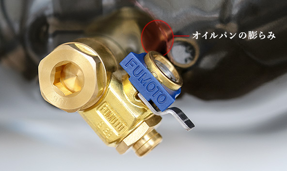 一部の車種ではオイルパンの形状に膨らみがあり、水平に取り付けられないものがあります。その場合は、斜め下向きに装着してください。